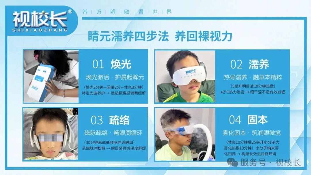 视校长·明眸护眼中心以东方智慧为炬,睛元濡养为纲;焕光破朦胧,热导润枯涩;磁脉化千结,雾化筑微穹。不书治愈之诺,但刻睛彩之约;令少年养眸元,待鹤发映瞳春。焕东方·濡天地疏寰宇·固文明